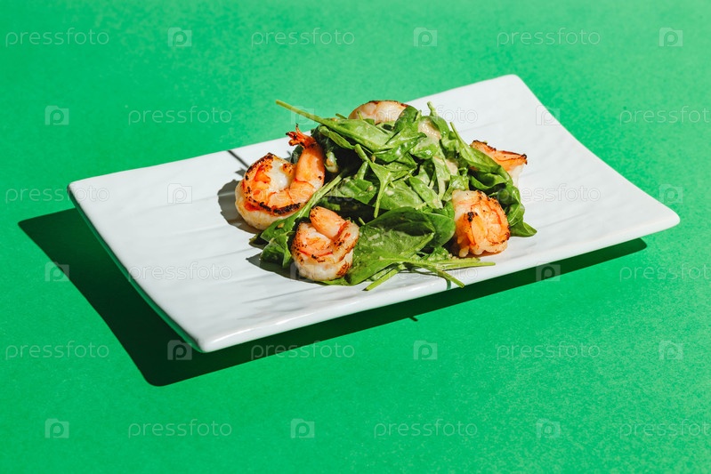 Салат с креветками и ругулой на белом блюде на цветном фоне