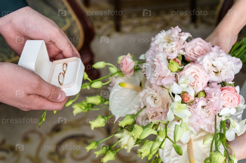 Жених держит обручальные кольца, невеста - букет