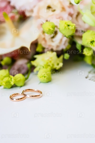 Пара золотых обручальных колец лежит на белой бумаге
