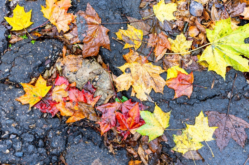 Красочные упавшие кленовые листья на мокром асфальте