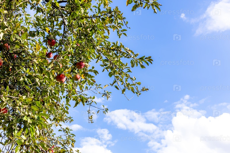 Зрелые красные плоды яблок на ветке дерева и голубое небо
