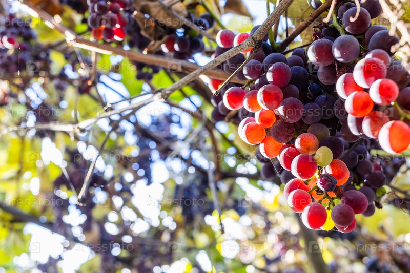 Виноград созревшего красного винограда Изабеллы, освещенный солнцем