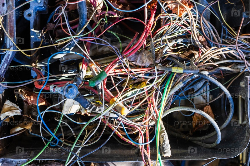 Запутавшиеся электрические провода в старой заброшенной машине