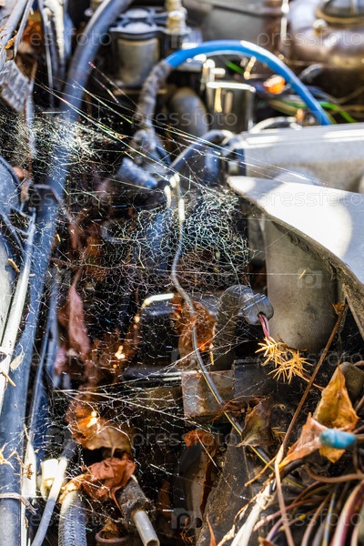 Шпионская паутина, освещенная солнцем под капотом заброшенной машины