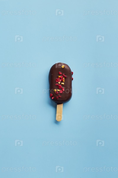 Моссовый десерт с фруктовыми ароматами в виде мороженого из макарон, покрытого темным шоколадом на синем фоне