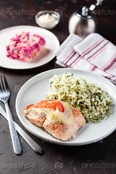 Ужин за столом с различными блюдами, меню для полного здорового обеда в ресторане, деловой ланч