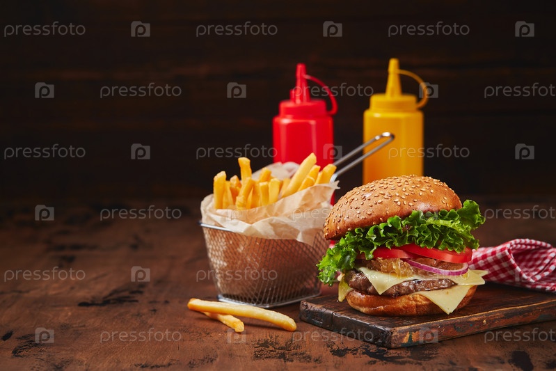 Самодельный бургер с говядиной, сыром и мармелад из лука на деревянной доске, картофеля в металлической корзине и соусов