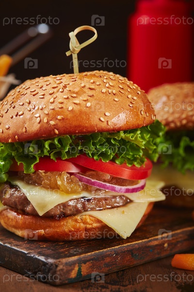 Апетитный домашний бургер с говядиной, сыром и мармеладным луком в ближайшем плане