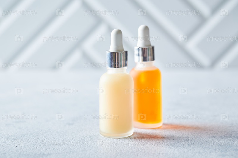 Стеклянные бутылки с продуктами по уходу за кожей лица или тела на светлом фоне