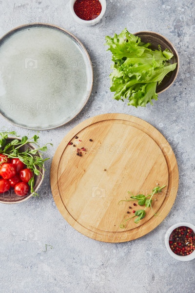 Деревянная круглая доска для резки, зелень, овощи и приправы на светлом фоне
