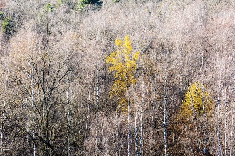 Желтое дерево в голом лесу городского парка осенью
