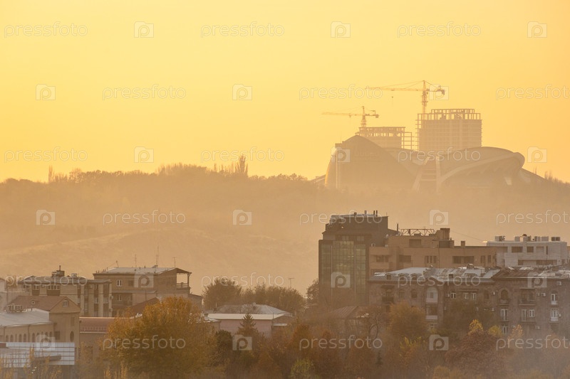 Здания в Ереване на жёлтом дымном закате