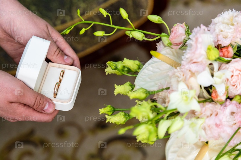Жених держит обручальные кольца возле свадебного букета