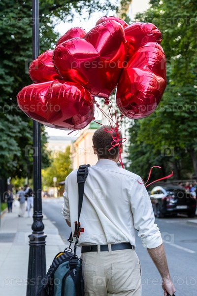 Мужчина несет красные блестящие воздушные шары по улице