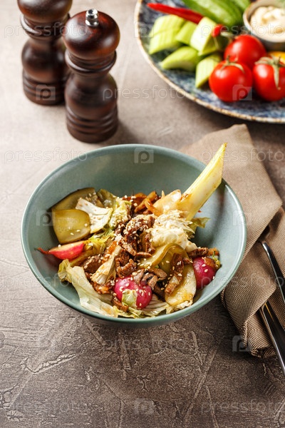 Салат с говядиной, китайской капустой, фенхелем, устричными грибами, огурцами и редьками