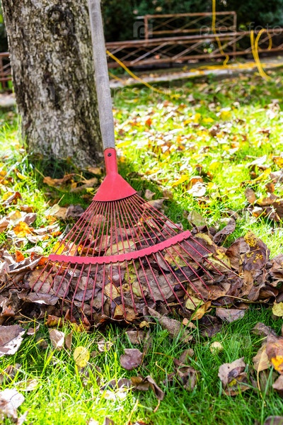 Фан-рейк с кучей упавших листьев на зеленой лужайке