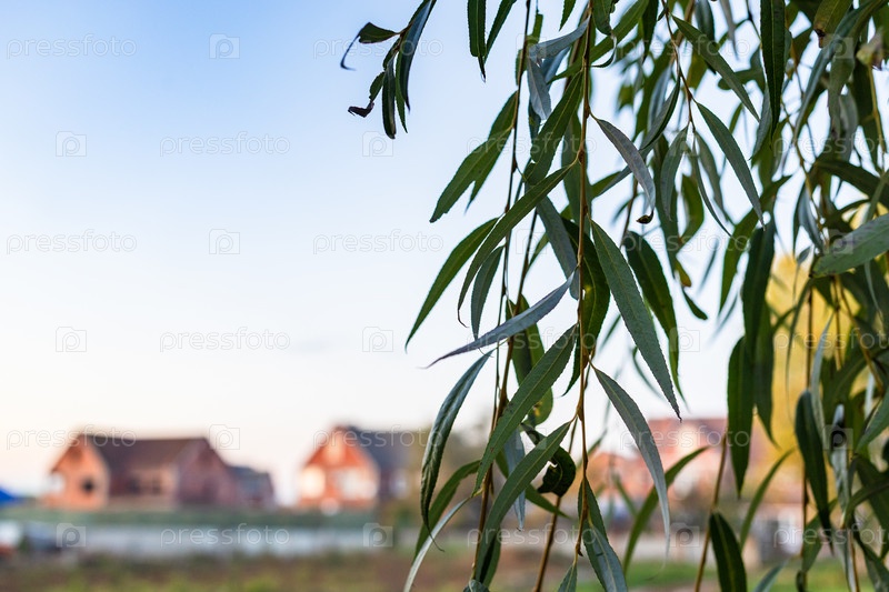 Листья ивы на переднем плане и сельский пейзаж
