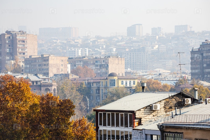 Вид на Кентрон из Еревана в солнечный дымный день