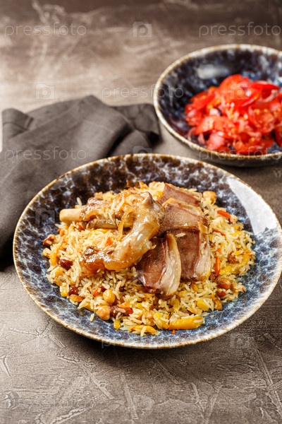 Пилаф с бараниной в большом блюде и тарелка томатного салата