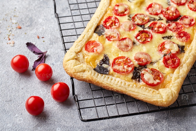 Пирог с вишневыми помидорами, моцареллой и фиолетовым базиликом
