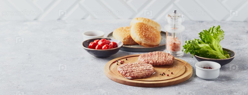 Стейк-котлеты с сырым бургером на деревянной режущей доске