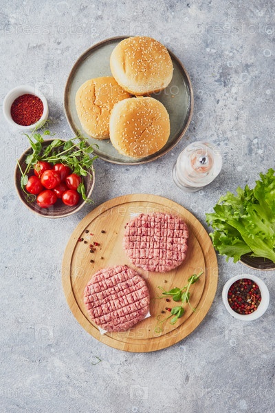 Сырое теленочное мясо, стейк-котлеты на деревянной доске
