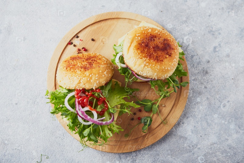 Два бургера с телячьим котлетом и травами на деревянной доске для резки