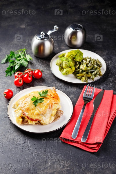 Ужинный стол с тарелкой выпечённого мяса с сыром, брокколи со зелёными бобами и вкусными пирогами, меню для питательного ресторана здорового питания, бизнес-обед