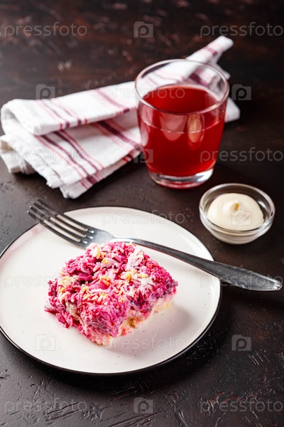 Обеденный стол с тарелкой сельди и свекольного салата, меню на обед в ресторане, бизнес-обед