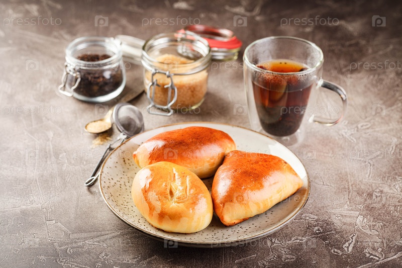 Пироги со сладкими дрожжами с различными начинками на блюде и стакане чая