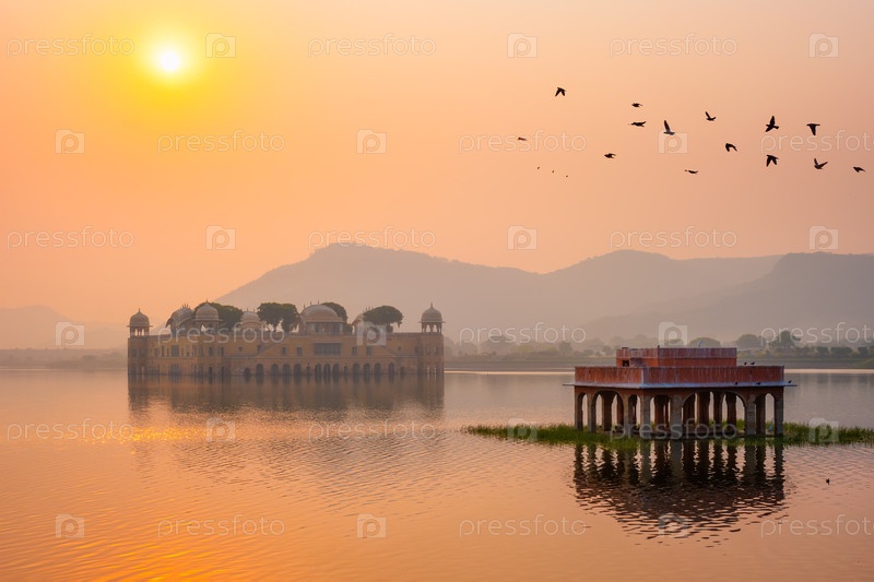 Спокойное утро в знаменитой индийской туристической достопримечательности Джаль-Махал (Водяной дворец) на рассвете в Джайпуре