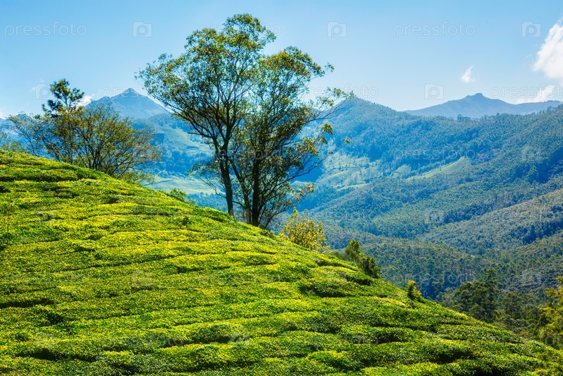 Зелёная чайная плантация утром с деревом.Муннар, штат Керала, Южная Индия