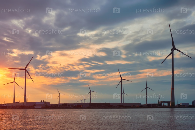Ветряные турбины генераторы электроэнергии в порту Антверпена на закате.Антверпен, Бельгия