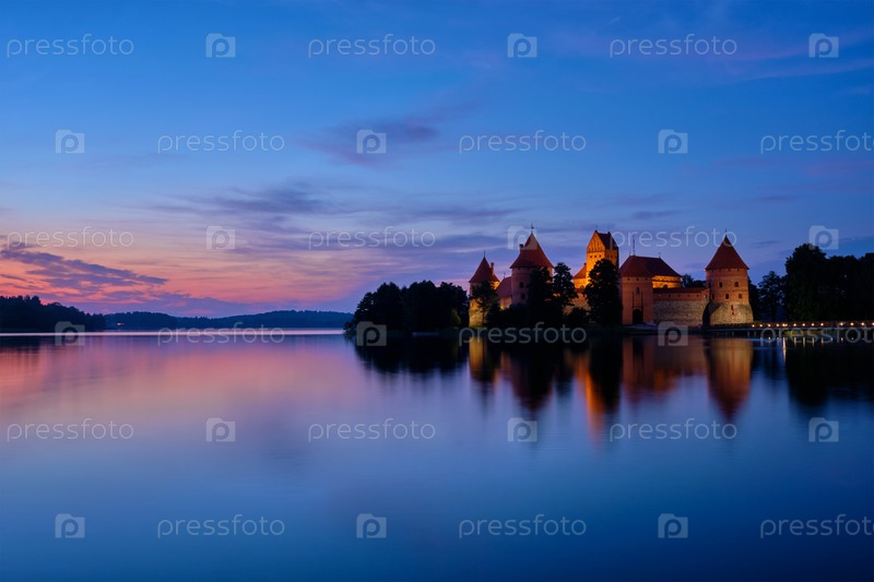 Ночной вид на Замок острова Тракай в озере Гальве, освещенный вечером, Литва