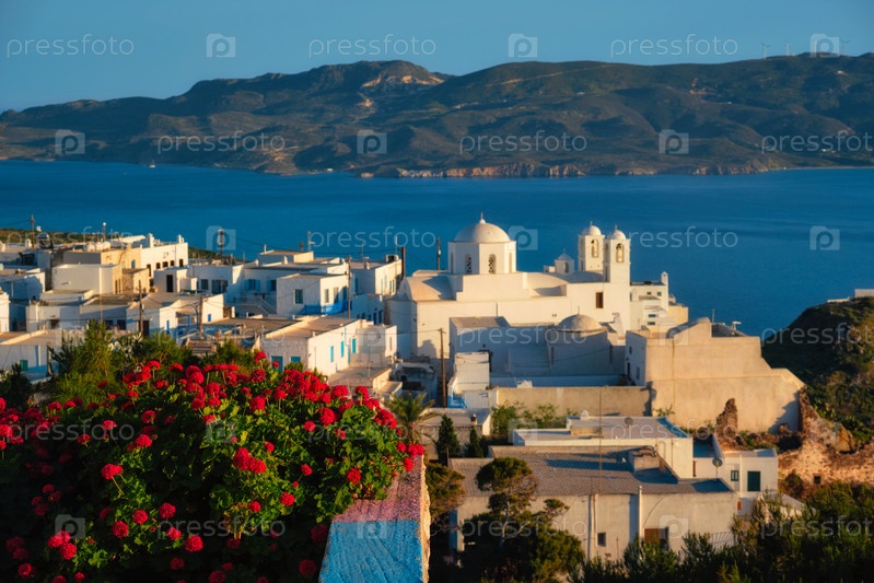 Вид на деревню Плака на острове Милос над красными цветами геранима при закате