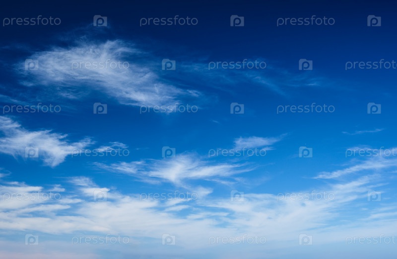 Голубое ясное небо с белыми цирковыми вращающимися облаками