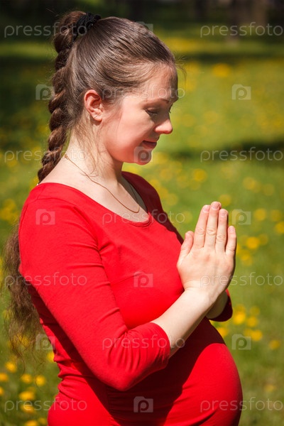 Упражнения йоги во время беременности - Беременная женщина Dos Asana Tadasana Namaste - Горная поза с приветствиями на открытом воздухе на травяной газоне с магдалонами летом