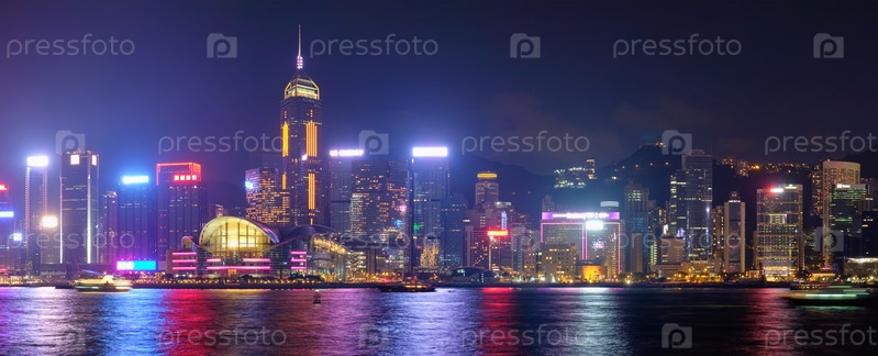 Панорама небоскребов Гонконга в центре города над гаванью Виктория осветила туристические лодки и паромы вечером