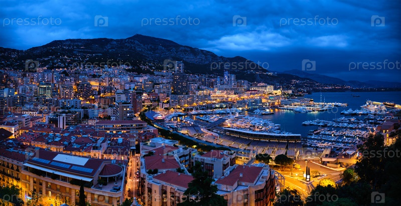 Панорама аэропорта Монако Монте-Карло и освещенный городской горизонт во время вечернего синего сумерка