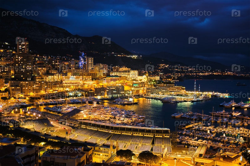 Вид с воздуха на гавань Монте-Карло Монако и освещенный городской горизонт во время вечернего синего сумерка