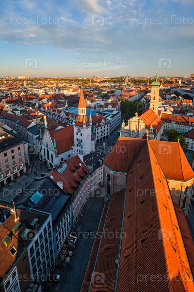 Вид с духом Мюнхена - Marienplatz и Alytes Rataus в исцелениях святого Петра из Заката