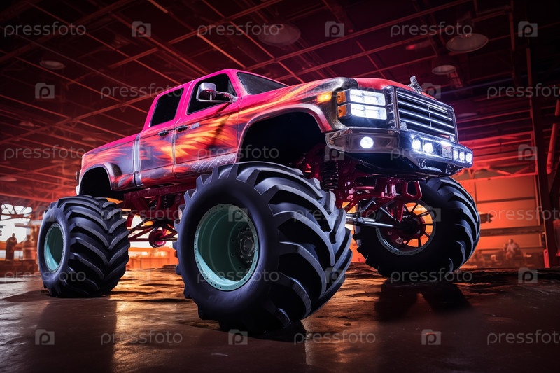 Грузовик-монстр, освещенный неоновыми огнями - волнение и острые ощущения экстремальных видов спорта и развлечений - гоночное шоу