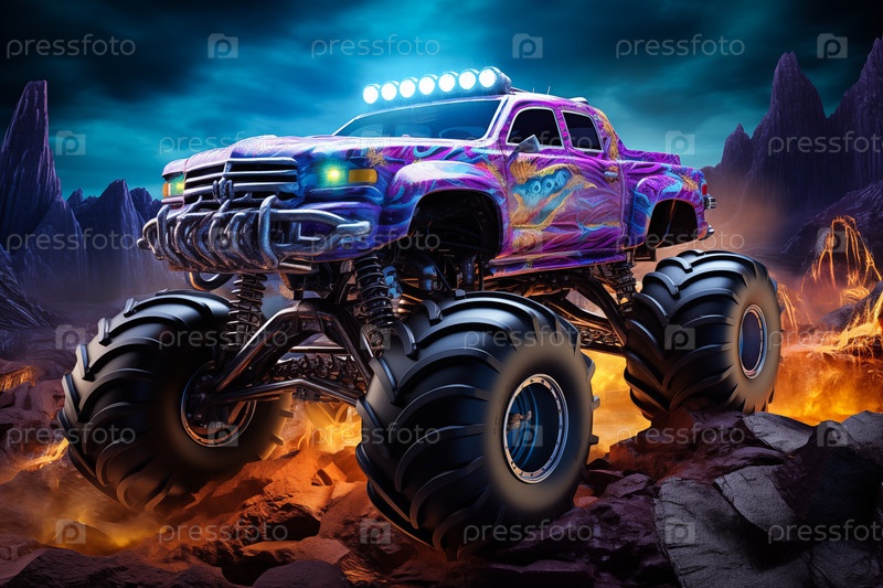 Грузовик-монстр, освещенный неоновыми огнями - волнение и острые ощущения экстремальных видов спорта и развлечений - гоночное шоу