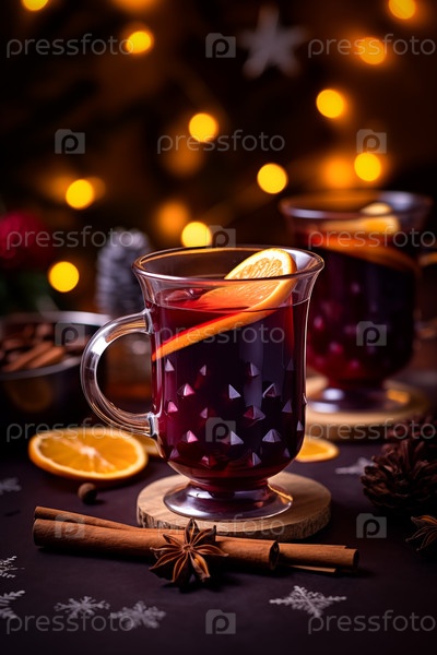 Два стакана традиционного горячего вина с апельсиновыми и клюквенными блюдами на уютном рождественском столе.Фон размыт огнями боке и свечами, создавая теплую и праздничную атмосферу
