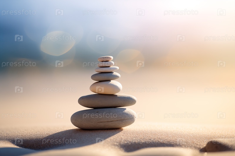 Камни Дзен складываются на песчаных волнах в минималистической обстановке для баланса и гармонии