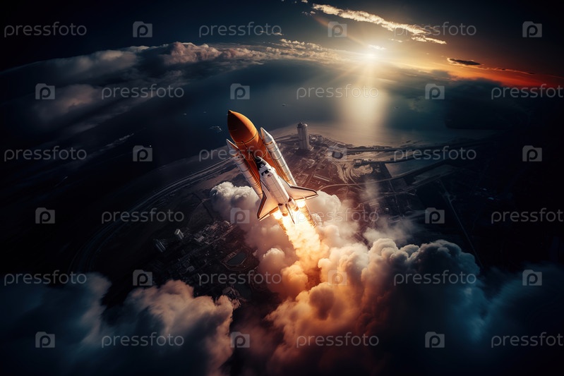 Вид с воздуха запуска ракеты на рассвете над побережьем океана