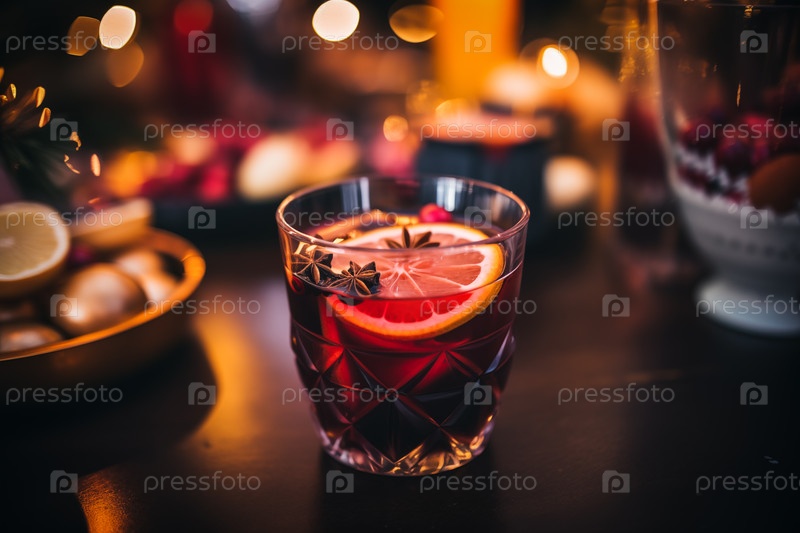 Стакан традиционного горячего вина с апельсиновыми и клюквенными блюдами на уютном рождественском столе.Фон размыт огнями боке и свечами, создавая теплую и праздничную атмосферу