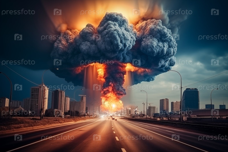 Ядерный взрыв и грибное облако на горизонте. Взрыв разрушает здания, вызывает хаос и разрушения. Апокалиптическое настроение. Разрушение войны или последствия катастрофы