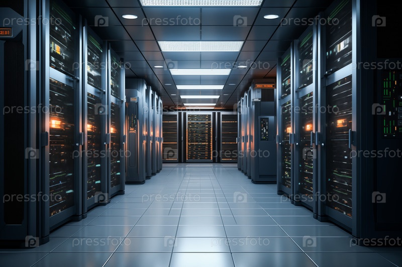 Современный дата-центр с рядами серверных раков - высокие технологии, искусственный интеллект ИИ и облачные вычислительные данные компьютерного хранилища и телекоммуникационных систем