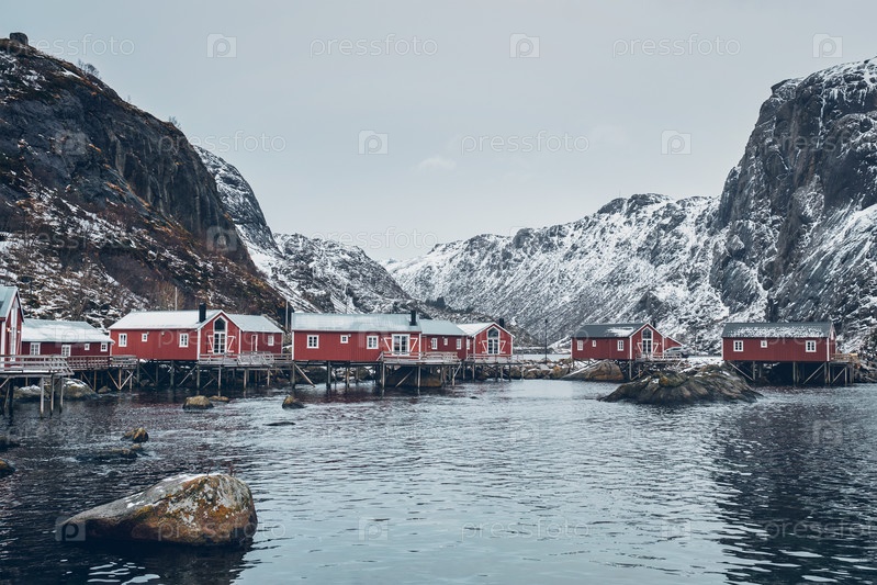 Нусфьорд - это аутентичная традиционная рыбацкая деревня с традиционными домами красного руербу в норвежском фьорде зимой